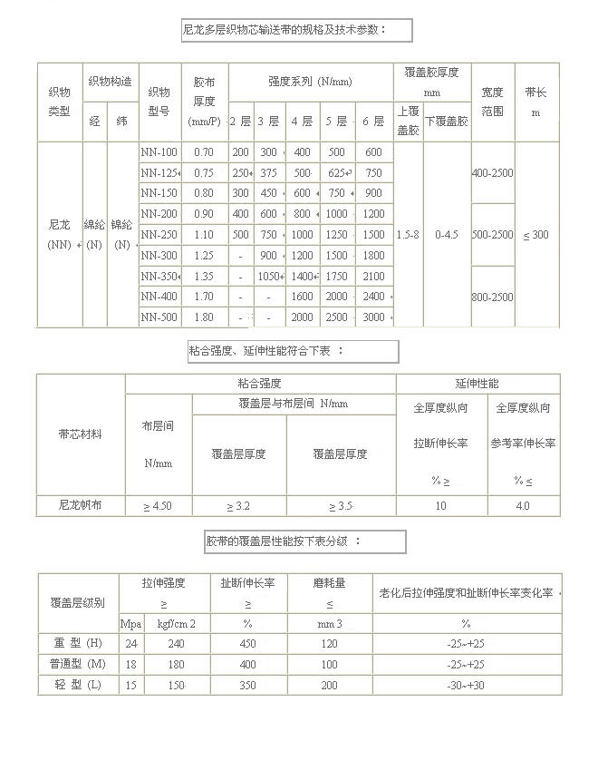結(jié)構(gòu):采用棉帆布、尼龍或聚酯帆布做抗拉體。 特點:帶體輕、薄、強力高、耐力疲勞、耐沖擊、成槽性好、使用壽命長、EP帆布芯輸送帶還具有延伸率低、尺寸熱穩(wěn)定性好、濕強力高
